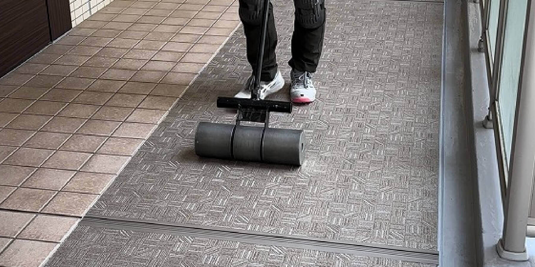 防滑性シート工事では、マンションや施設の共用部などで、防滑性とデザイン性を両立した長尺シートを施工。歩きやすく、安全で快適な空間づくりを目指しています。